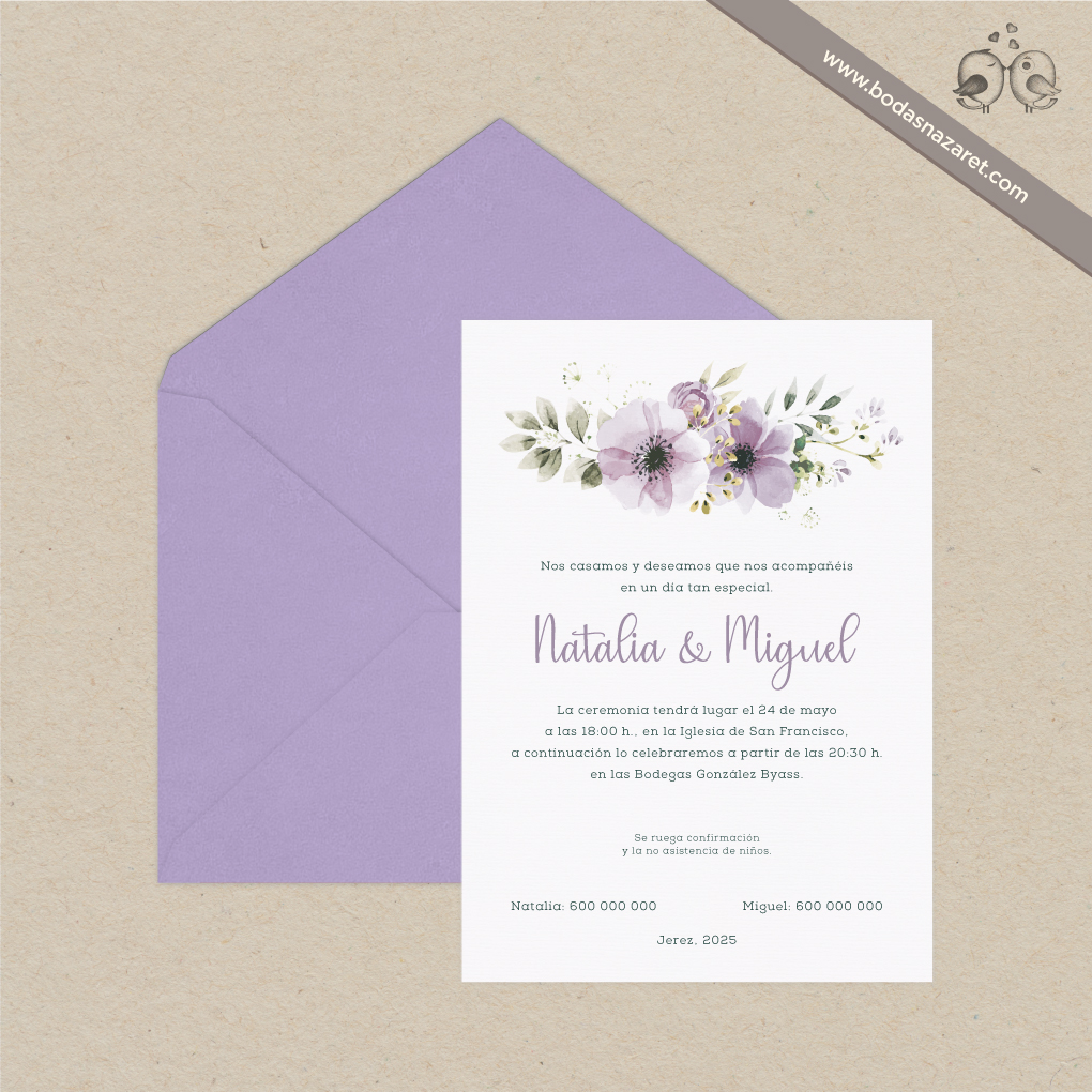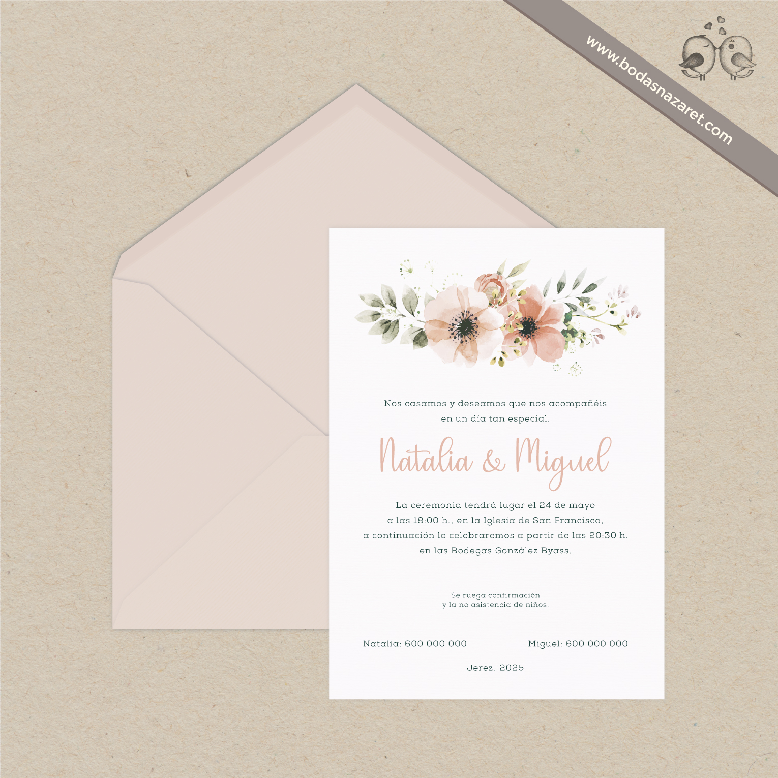 Invitación de boda con sobre rosa nude (22,8x16,5cm) realizado con papel italiano de alta calidad con textura rayada (140g) o sobre malva (22,8x16,5cm) realizado con papel italiano de alta calidad con textura (140g), con tarjetón blanco verjurado de 300g (22x15,5cm) totalmente personalizable. Con un diseño de flores, es una opción ideal para una boda alegre y chic.Además, también puedes personalizar: