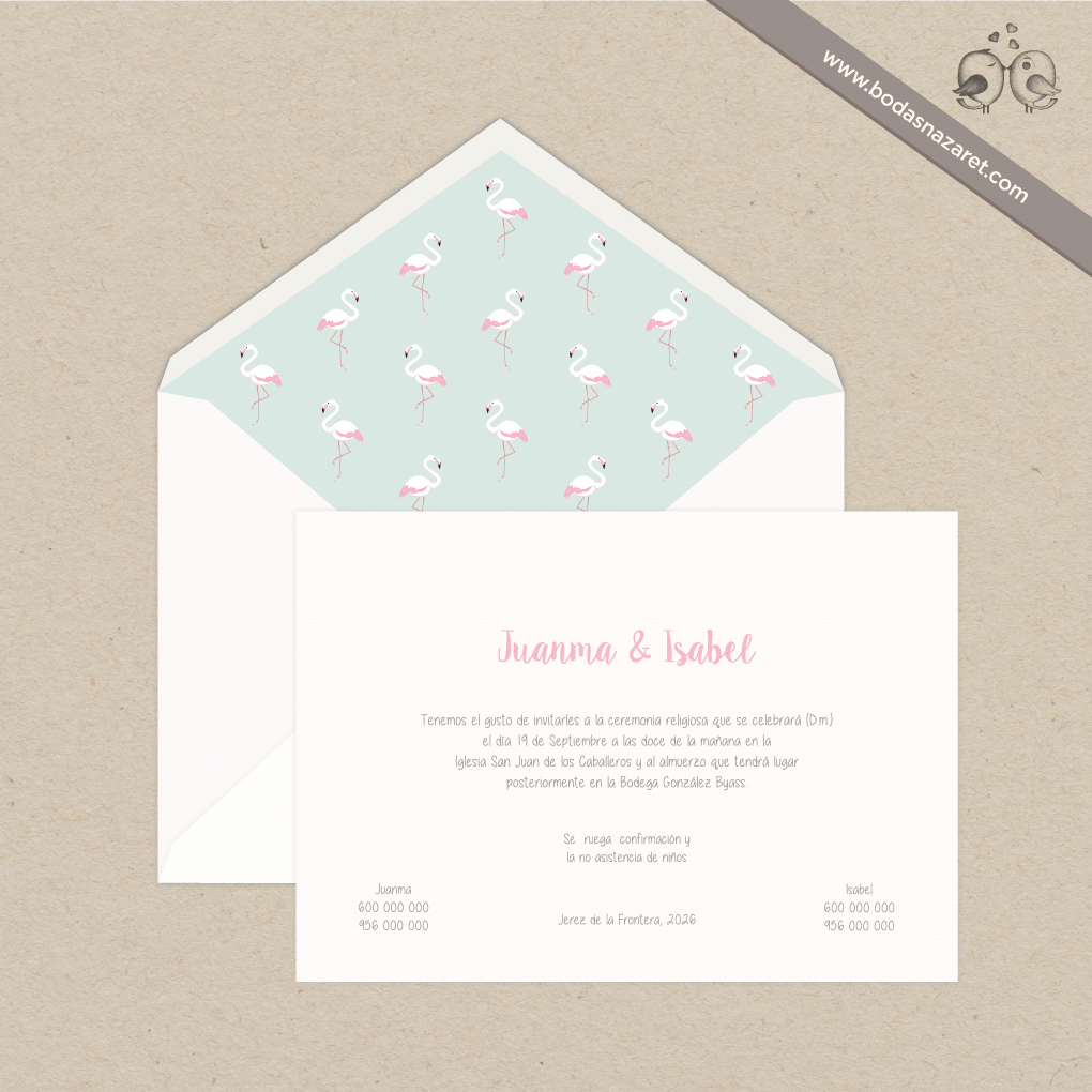 Invitación de boda con sobre blanco (22,8x16,5cm) realizado con papel italiano natural de alta calidad (140g) con textura rayada por ambas caras, forrado de manera artesanal y tarjetón blanco verjurado de 300g (22x15,5cm) a juego totalmente personalizable. Con un diseño con flamencos, es una opción ideal para una boda diferente y elegante.